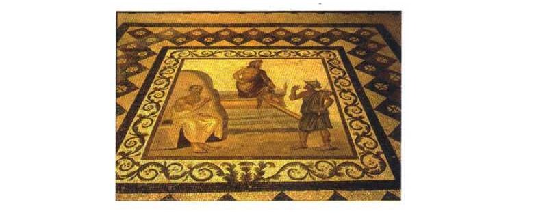 Figura 6: Mosaico de Asclepeion de Kos, con Asciepio en el centro, Hipócrates a la izquierda y un habitante de Kos a la derecha