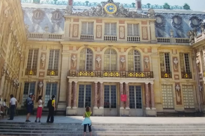 Para ingresar, se cruzaba un patio con mármoles blancos y negros y una fuente central y transpuesto la entrada, nos encontrábamos con una exposición histórica que narra los hechos de la Francia desde el siglo XIV hasta nuestros días. Estos vastos recintos están revestidos de materiales nobles, como el mármol, el bronce, el cobre y la plata, bellamente trabajados. Pinturas y esculturas de los principales artistas de la época adornan las paredes y rincones del palacio. Los techos, pintado en paneles, son deslumbrantes. En esta ala, se visita una exquisita capilla donde Luis XIV asistía a misa diaria. Luego, se cruza por una espectacular galería de espejos, de 70 metros de longitud, flanqueada a cada lado por los amplios salones de “la guerra” y “la paz” para llegar a los departamentos del Estado que incluía la Sala Hércules (así llamada por las pinturas en el techo) y las suites reales con magnífica decoración. En el enorme aposento del rey Luis XIV, decorado con elementos nobles de oro y plata con sus paredes recubiertas en terciopelo y excelentes cuadros que el mismo rey seleccionara, él atendía en su cámara los asuntos cotidianos y no protocolares, y allí permaneció hasta su muerte en 1715. La estancia de la reina muestra una bella cama con dosel, en la cual nacieron 19 hijos reales, muchos observados durante la parición por altos representantes de la realeza. María Antonieta empleó dicha estancia hasta 1789, en la que fue arrestada para ya no regresar.
