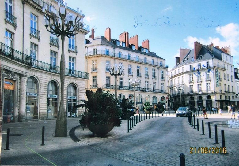 A Nantes fuimos en el verano del 2016 en vuelo directo de Iberia, con escala en Madrid. Llegamos al anochecer. Era comienzo de agosto y un aire tibio y húmedo nos arrancó del invierno argentino. Mientras el taxi volaba hacia el hotel, nos sorprendió para una ciudad que ya se mostraba importante la escasa gente que circulaba por las calles, el poco tránsito y los bares y restaurants cerrados en su mayoría. Poco después y ya instalados, durante la cena en el hotel nos explicaron la causa: ¡en agosto todos (la mayoría) toma vacaciones y sus comercios permanecen cerrados! Desde luego no es buena época para conocer Nantes. Sin contar que se agregaron las tormentas del verano que nos retuvo en el hotel más de lo deseado.