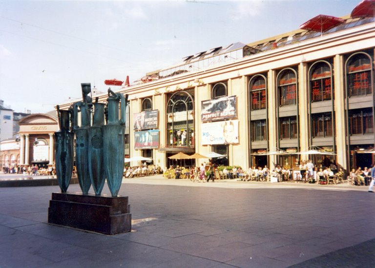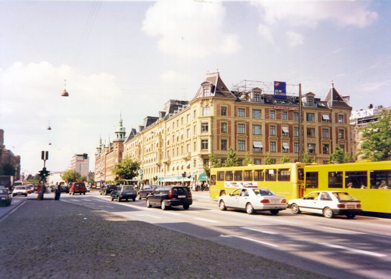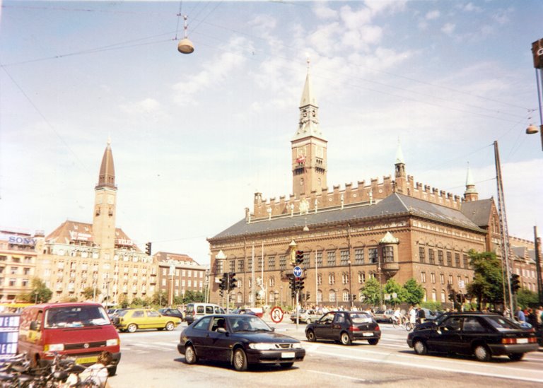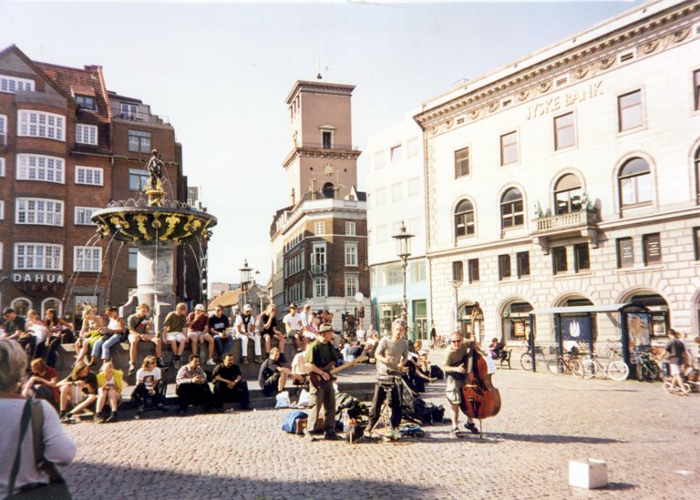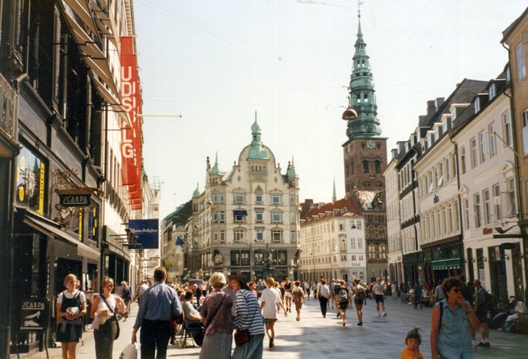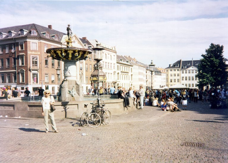 Caminar por sus principales calles peatonales tiene también un particular encanto. De comienzo, salimos del Hotel, en ese entonces un Sheraton que posteriormente fue comprado por una empresa escandinava (el Scandic, si mal no recuerdo), y poco antes del ingreso a Tívoli nos sumergimos con Martha en la marea humana que diariamente recorre “Stroget” (que significa camino hacia el centro y no una calle en particular) Nuestra primera parada, para contemplación y tomas de fotos (mi “memoria activa” de los viajes), fué frente al gran Palacio del Ayuntamiento, o Municipalidad, en la plaza homónima. El bello y macizo edificio de color marrón muestra un frente almenado como una fortaleza y a su costado izquierdo, una aguda torre con reloj, que se dispara hacia las alturas. En la plaza que lo enfrenta, esculturas de bronce y una fuente con surtidores de agua, engalanan el lugar mientras que en una de las avenidas laterales, una elegante columna se eleva entre 20 y 30 metros, sirviendo de pedestal a dos curiosas figuras en bronce, que soplan largas y curvilíneas trompetas. En esa plaza, son frecuentes las demostraciones populares de júbilo, protesta o en defensa de determinas causas o etnias y así hemos visto, en diferentes momentos, desde agrupaciones indígenas expresándose por sus derechos originarios hasta conjuntos musicales que recuerdan a algún país exótico. La plaza desde donde se eleva el Ayuntamiento se denomina “Nystorv” o plaza nueva, en contraposición con la que se extiende cruzando la avenida que es la “Gammeltorv” o plaza vieja, proveniente de la edad media donde asienta el más antiguo mercado de Copenhagen. En el centro de esta plaza se levanta otra bonita fuente cuyas figuras centrales simbolizan a la caridad y donde chorros de agua producen un agradable efecto estético.