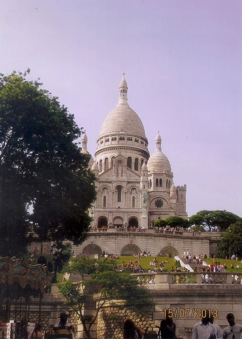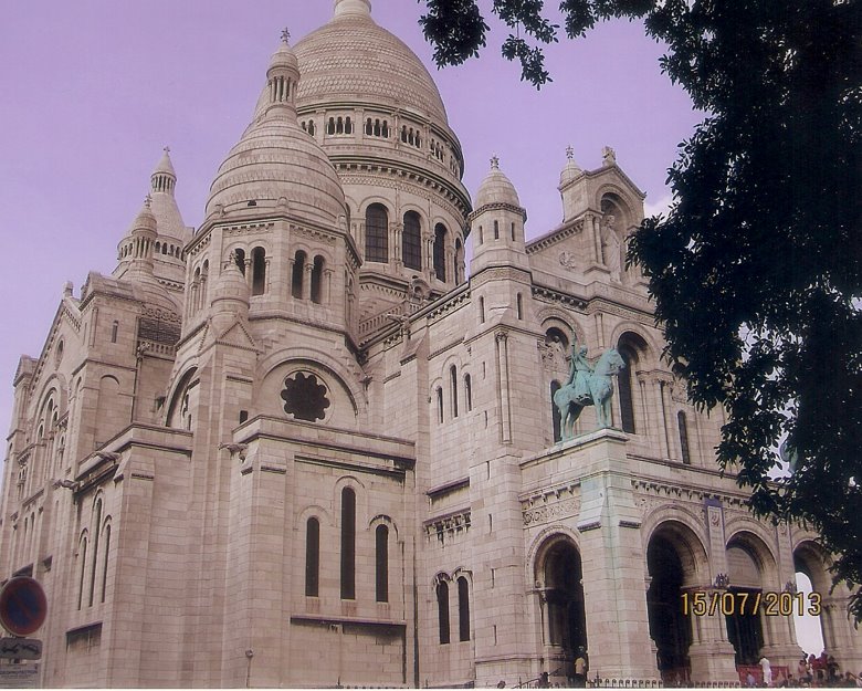 En este París inacabable, otra colina, lejana desde el Sena, determinó un imborrable recuerdo: la de Montmartre. Al parecer, su nombre deriva de la frase “monte de los mártires”, ya que San Denis, primer obispo de París, fue torturado y decapitado en ese lugar, junto a dos de sus prelados. En esa elevación se levantó después una formidable iglesia de perfil muy característico y cúpulas blancas denominada, “Sacre Coeur”. Una amplísima como interminable escalera, permite trepar por la colina para llegar a su puerta, o bien un simpático teleférico cumple la misma tarea. En la pequeña terraza que enfrenta la basílica, la estatua ecuestre de San Luis y la de Juana de Arco, montan guardia perpetua. La mole blanca de la iglesia, imponente sobre la colina, es una figura familiar al visitante y casi rivaliza en popularidad con la torre Eiffel. La torre del campanario que se estira al cielo un centenar de metros permite obtener, desde su ventana superior como lo pude comprobar en mis primeras visitas (años jóvenes) una vista extraordinaria de la gran ciudad.