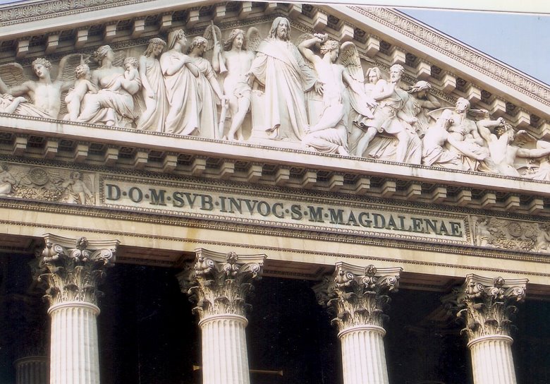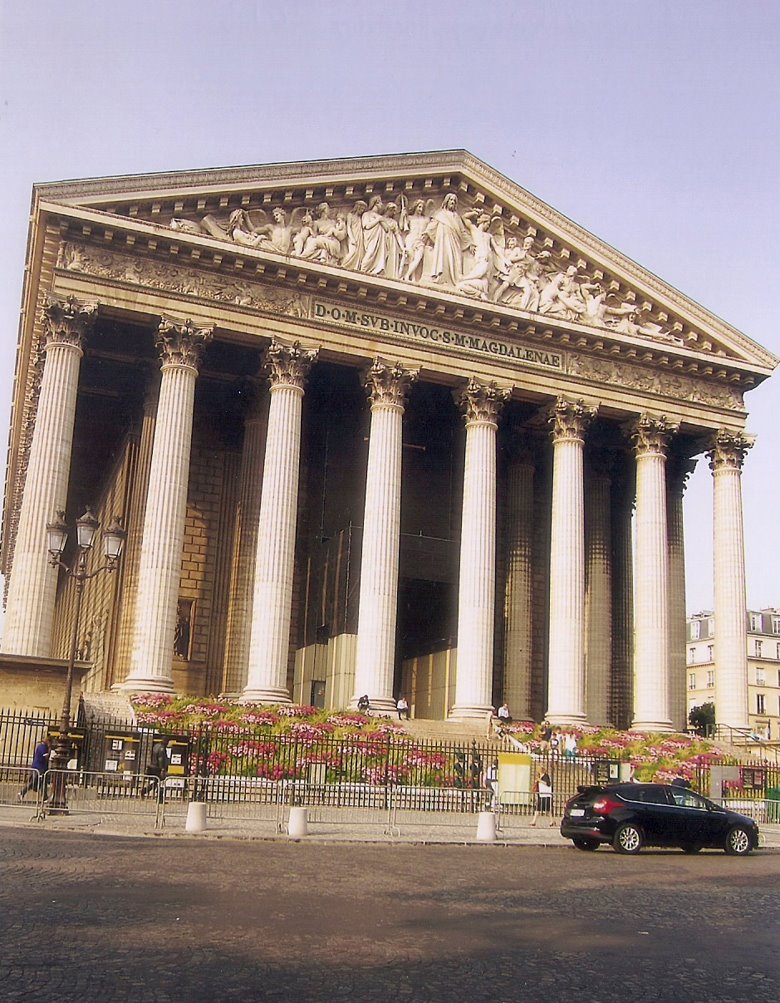 “La Madeleine” es uno de los edificios más visitados del centro comercial; comenzada a construir y demolida varias veces, proyectada con propósitos diferentes, la iglesia actual fue consagrada en 1842, es decir, una fecha bastante reciente para los parámetros europeos. A pesar de su juventud, su diseño imponente es griego clásico, con una serie de columnas corintias que soportan en los cuatro frentes, un elaborado friso con múltiples esculturas. El cuerpo de la basílica parece elevarse del plano de la plaza, ya que asienta en una plataforma que consta de 28 escalones. Las enormes puertas de ingreso son de bronce, con magníficos bajorrelieves sobre temas de los diez mandamientos. El techo está constituido por tres cúpulas que facilitan la entrada de la luz al edificio. El interior resuma amplitud y está ricamente decorado.