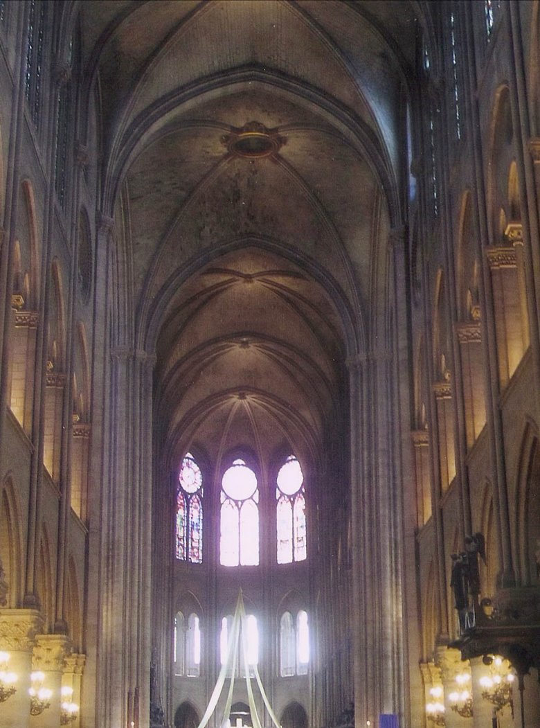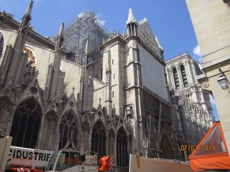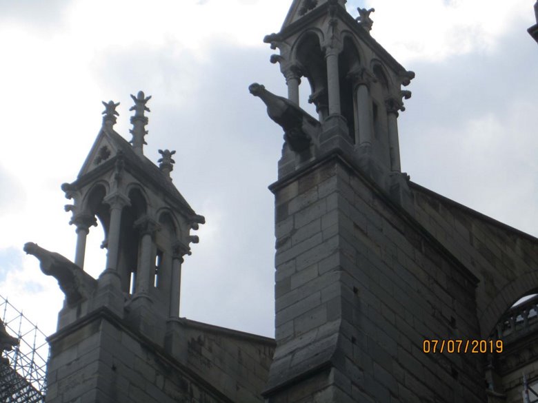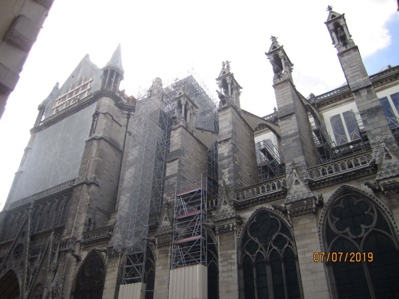 Nosotros fuimos en junio de ese año (2019) en nuestro último viaje a París y la encontramos convaleciente, rodeada por andamios y sostenes, sin su característico techo gris pizarra que había desaparecido y sus granes rosetones laterales recubiertos por madera para evitar su fragmentación. Desde luego la elevada aguja del techo había desaparecido y el contrafrente no podía apreciarse, totalmente cubierto por los trabajos de reparación. Pero vista de lejos, las dos torres del frente irradiaban su majestad de siempre al ambiente parisino.