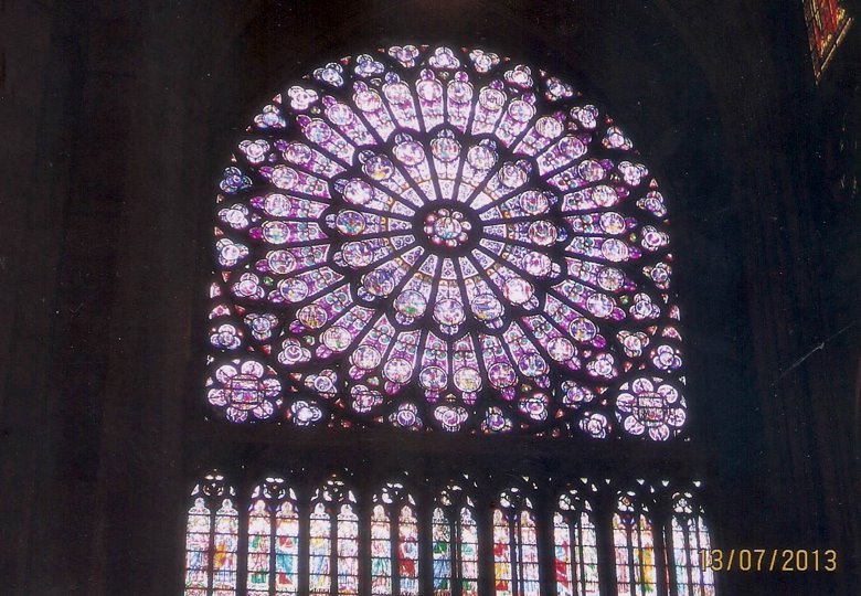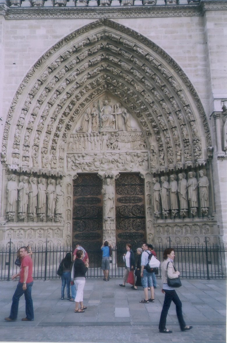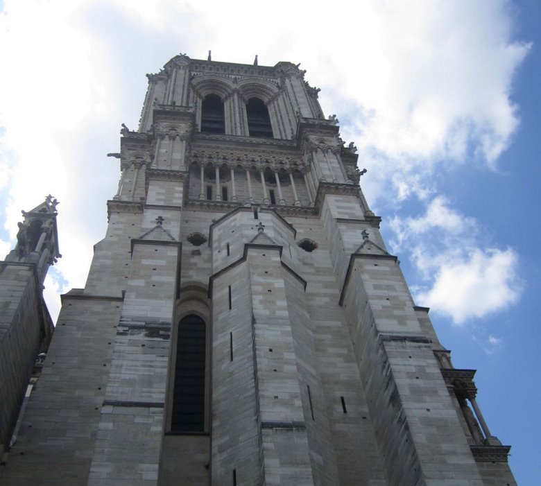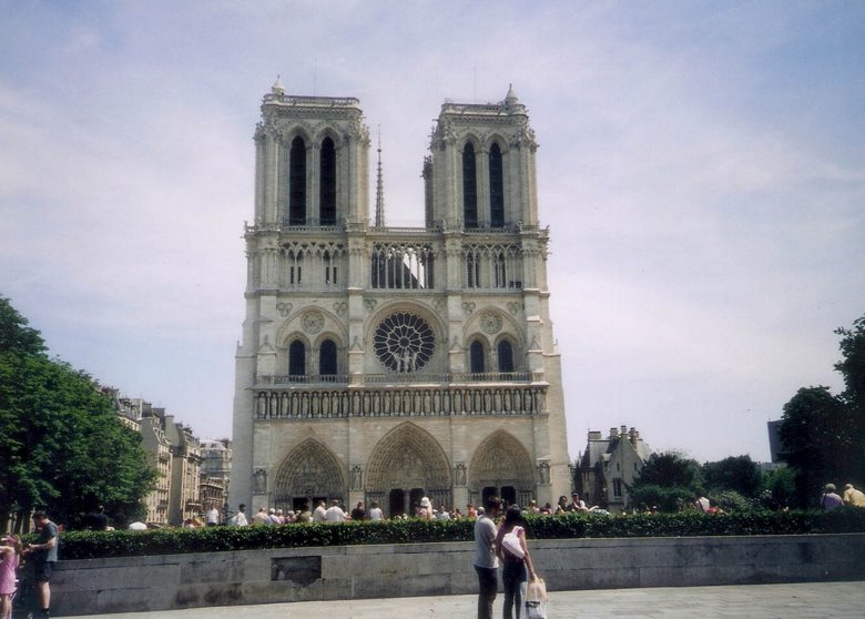A pocas cuadras de la “Saint Chapelle”, asentada sobre la isla del Sena, se encuentra otro de los “íconos” de París, la gran catedral, Nuestra Señora de Paris o “Notre Dame” de Víctor Hugo, por cuyas torres quizás aún se ve deambular, buscando a su amada, la sombra deforme de Cuasimodo. Los amplios jardines que la circundan favorecen su contemplación; se lo considera como el edificio religioso más bello de la ciudad y una verdadera obra de arte de la arquitectura francesa. La catedral se comenzó a construir en el siglo XII y se destaca por la simplicidad y armonía de sus líneas con un estilo gótico clásico. Las dos torres frontales, de 70 metros de altura, trasmiten serenidad y equilibrio. La del sur contiene una famosa campana del siglo XVII, que solo tañe los días religiosos y en ceremonias oficiales. En la fachada central, se destacan tres portales ricamente ornamentados y asimétricos; más grande la puerta del medio, recibe el nombre de “Juicio Final”, siendo la entrada; de la derecha, la puerta de Santa Ana y la de la izquierda, el portal de la Virgen por las estatuas y bajorrelieves de María de gran valor artístico, que la rodean. Por sobre las puertas, se alinean 28 estatuas que representan los reyes de Israel de donde desciende Cristo. Y más arriba, en el centro mismo del frente, se abre un enorme rosetón o ventana circular ocupado por un vitraux de bellos colores rojos y azules. En el techo, por detrás de los campanarios y a la altura del crucero, se elevaba un torre en fina aguja alcanzando la altura máxima en la construcción y proyectando un perfil que se volvió característico, aunque la misma se agregó a la estructura mucho tiempo después de su inauguración.