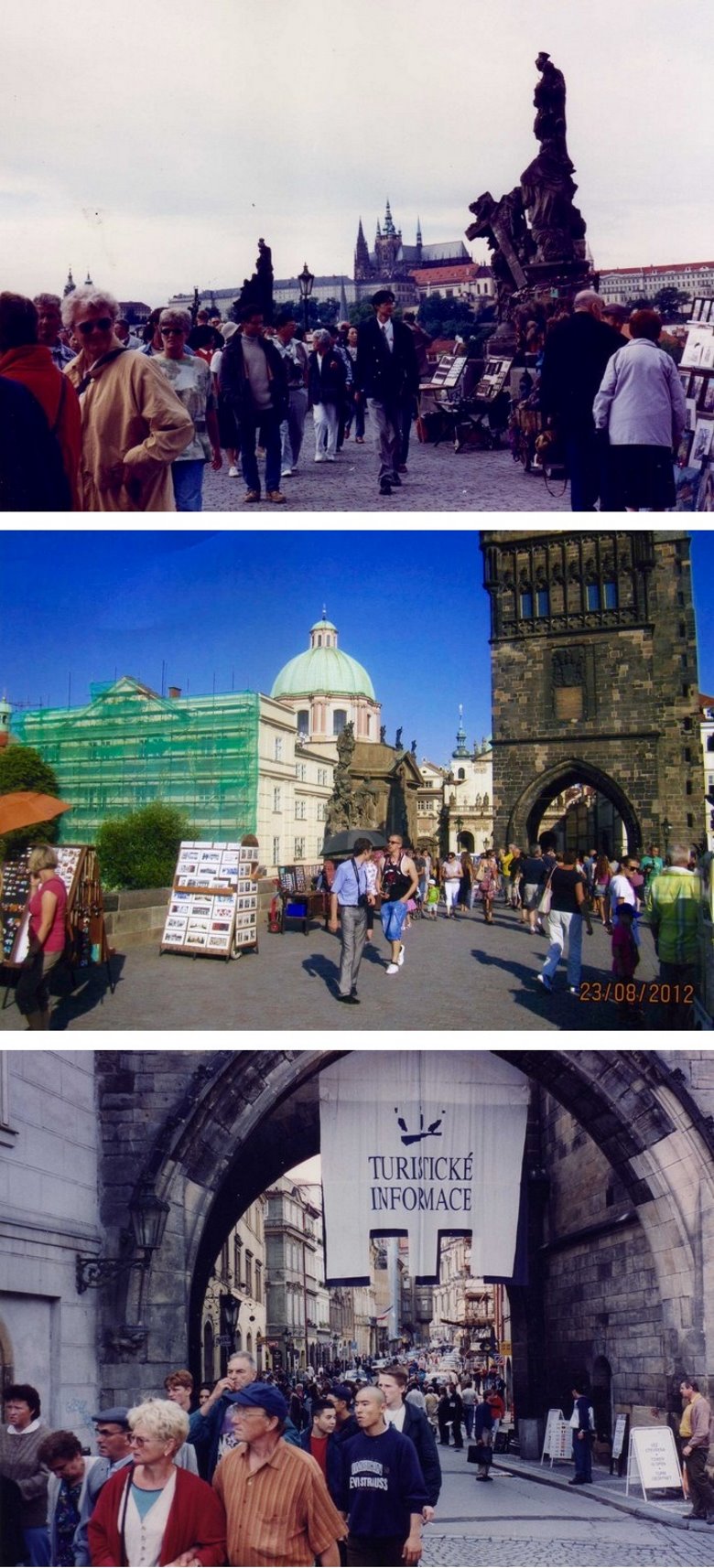 En cuatro oportunidades, separadas por un largo tiempo, tuvimos el privilegio de recorrer las calles, monumentos, palacios Iglesias o simples edificios que se han levantado sobre ambas orillas del río Moldava, cruzado por múltiples puentes y que han persistido intocadas los últimos 10 siglos ya que las dos grandes guerras europeas, del 14 y del 40, más las dominaciones nazis y comunistas por casi milagro, no afectaron la estructura de esta mágica ciudad. Nuestras visitas ocurrieron en el 95, 2007, 2014 y 2017, es decir, que se iniciaron luego de la caída del muro de Berlín y la apertura de esa magnífica región de la Europa central, al turismo libre, sin aduanas ni restricciones.En nuestra primera visita, veníamos desde Múnich, por las amplias autopistas alemanas, para ingresar en Checoslovaquia (aún no se habían separado), notando un cambio brusco de panorama pues de las verdes campiñas, bonitas propiedades y tractores y automóviles relucientes, se pasó a un medio más pobre, con casonas de paredes descascaradas y sin pintura, ventanas con sus vidrieras rotas, techos ya sin tejas y autos antiguos. Las estaciones de Servicio mostraban un aspecto precario y la autopista se transformó en una carretera de dos manos, aunque en la actualidad, sigue la autopista. Pasamos por Pilsen, ciudad de gran desarrollo industrial, que fabrica los autos Skoda y la buena cerveza Pilsen y al atardecer observamos perfil de Praga, sus iglesias y Castillo.