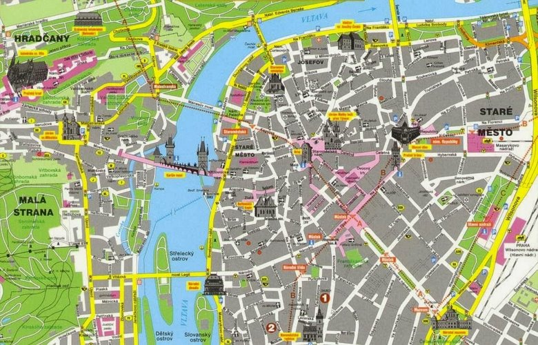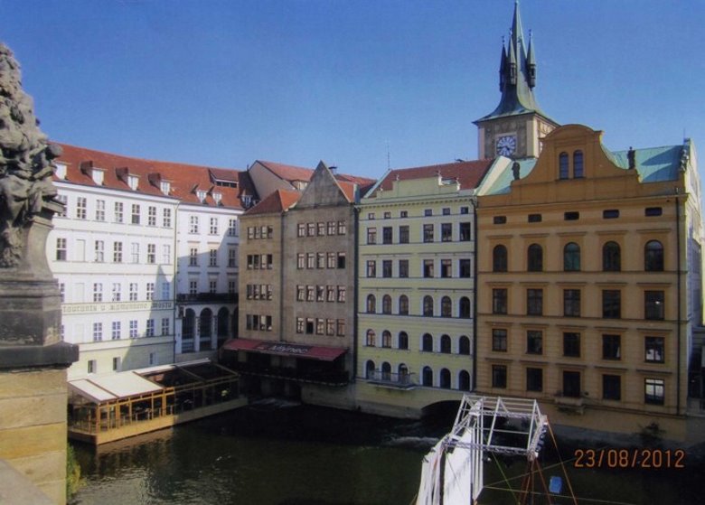 Llegado a la plaza de los Cruzados, tendremos a nuestras espaldas un conjunto de Iglesias y Conventos con fachada barroca, la iglesia de San Salvador y el Colegio Jesuita Clementinun. Sobre la ribera, se ve otra iglesia, llamada De los Cruzados que en su momento perteneció a la Orden de los caballeros Cruzados, única en Bohemia en tiempo de las Cruzadas. Además la plaza muestra un monumento a Carlos IV y la Torre del Puente de la ciudad Vieja que lleva al puente Carlos. Por último las casas construidas sobre la ribera fueron en su origen molinos de Agua y hoy día se han reconvertido, con vistosos murales en sus paredes,
