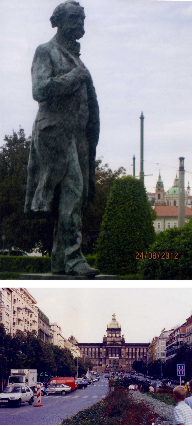 En esa primera visita nos alojábamos en un hotel de varios pisos sobre la plaza Wenceslao, en la ciudad nueva (nove mesto). Esta “plaza” es verdad un boulevard con unos 60 metros de ancho y unas 7 cuadras de longitud. Allí se levanta la estatua de San Wenceslao, bajo cuya sombra, el pueblo checo supo reunirse en situaciones difíciles como lo fue durante el aplastamiento por las fuerzas rusas del intento de liberalización conocido como la “primavera de Praga”. A pocos pasos de la estatua descubrimos otro monumento menor cubierto de ofrendas y flores que recordaba precisamente al estudiante Jan Palach, que se inmoló por el fuego como protesta final por la brutal represalia con los tanques soviéticos.