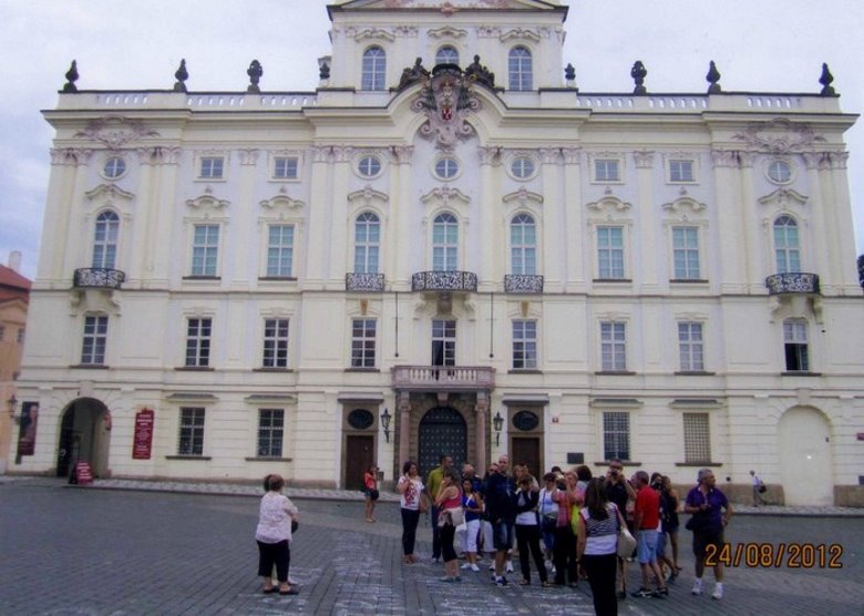 Este Castillo es una verdadera ciudadela, pues dentro de sus murallas alberga la residencia y salones reales, la Catedral San Vito y la iglesia San Jorge, un museo de armaduras y en un callejón recostado sobre la ancha muralla, casitas, oficinas y bares, así como diversos recintos de la antigua realeza. Finalmente, el Belvedere y la salida al exterior. Según la historia, el Castillo es el símbolo y el germen de la nación Checa. Nació con ella, hace más de 1000 años; el príncipe Borijov, construyó aquí un fuerte de madera y la primera iglesia cristiana. En el 973 se creó el obispado de Praga y el Castillo fue su sede. En el año 1000, tomaron impulso las grandes construcciones y en el siglo XVIII la emperatriz María Teresa ordenó los cambios en el estilo y estructura que llevó a mostrar el conjunto su aspecto neoclásico, que hoy conocemos. A diferencia de otros grandes palacios europeos, el de Praga se ha mantenido vivo, es decir, creciendo con la ciudad y evolucionando con las épocas según cambios religiosos o políticos. Siempre fue apreciado por la población, por lo que sus salones y edificios nunca sufrieron la furia revolucionaria. Después de albergar a reyes, emperadores, líderes comunistas y ocupantes alemanes, hoy es la magnífica sede del gobierno Checo y cuando estuvimos, el presidente Václav Havel tenía allí sus oficinas.