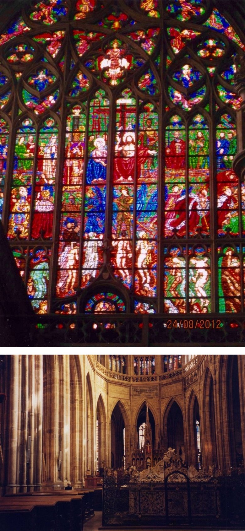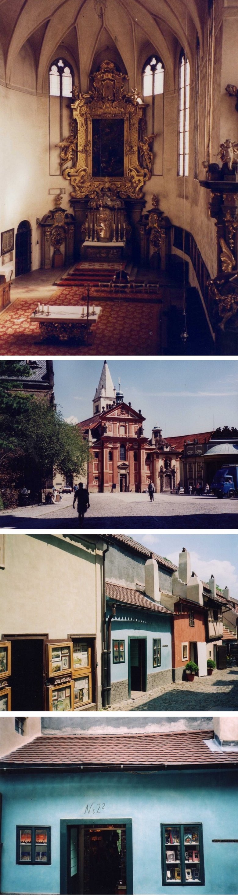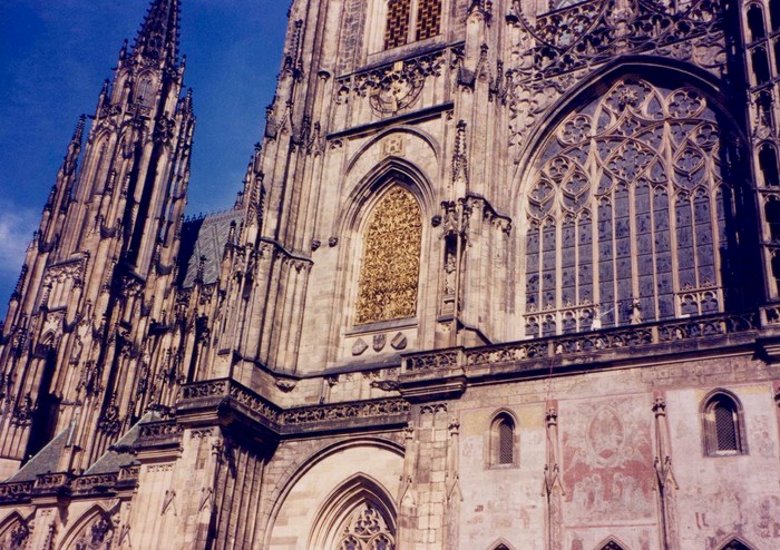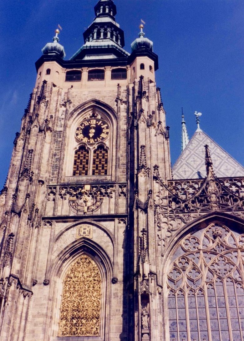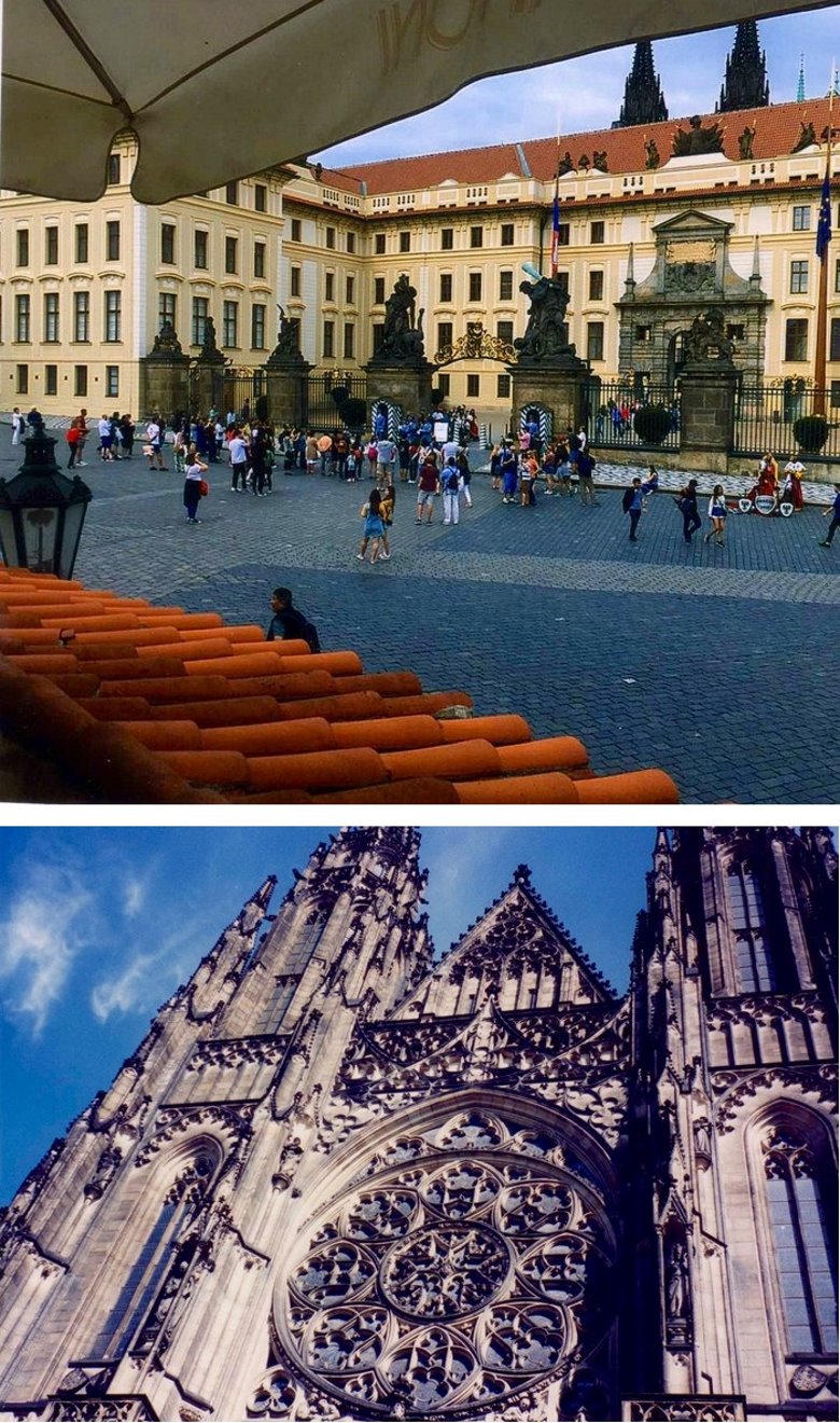 En el segundo patio puede visitarse la Capilla de la santa Cruz que guarda el tesoro cardenalicio. Contiene piezas de gran valor histórico y artístico que comienzan con el príncipe Wenceslao y culmina con el emperador Carlos V. También se observa un conglomerado de construcciones dispuestas con gracia y simetría, pasándose luego al tercer patio donde se destaca la imponente presencia de la Catedral de San Vito, la iglesia barroca más importante de Praga. Aquí están enterrados los reyes y emperadores que gobernaron el reino y se guarda el tesoro real. La obra comenzó bajo el reinado de Carlos IV, el gran constructor y siguió evolucionando hasta terminarse recién en el 1929, casi 600 años después de su comienzo. El frente de la Iglesia es una filigrana, con un rosetón en su parte media, de unos 10 metros de diámetro, con escenas de la creación del mundo; por debajo, luce una bella puerta de bronce donde se tallaron exquisitos bajorrelieves. En ambos lados surgen hacia el cielo, dos torres aguzadas, decoradas con las estatuas de distintos santos. El conjunto, difícil de apreciar por sus dimensiones, produce un impacto estético extraordinario. Y sus paredes laterales no son menos atractivas; la que da al este, hacia la fuente de San Jorge, muestra ventanas almendradas en paredes de mármol recubiertas por rejas bañadas en oro que refulgen con la luz del sol mañanero. Sobre ellas brilla la letra R que se corresponde con el rey Rodolfo II Escudos y mosaicos coloridos confieren al conjunto un equilibrio y encanto singular, rodeando a su torre principal, que se ubica sobre el crucero y que se eleva unos 100 metros hacia ese cielo azul que en mis visitas lucía inmaculado. La tentación de subirla fue insuperable y por dos veces transcurrí sus 293 escalones hasta el mirador superior, previo pago de la entrada, desde donde pude disfrutar de la vista insuperable de estos pulidos techos rojos de la Mala Strana, la silueta inconfundible de San Nicolás y más allá, la cinta plateada del moldava, sus puentes y la ciudad vieja con las agudas torres de sus incontables iglesias entre las que sobresale la extraordinaria Teyn.