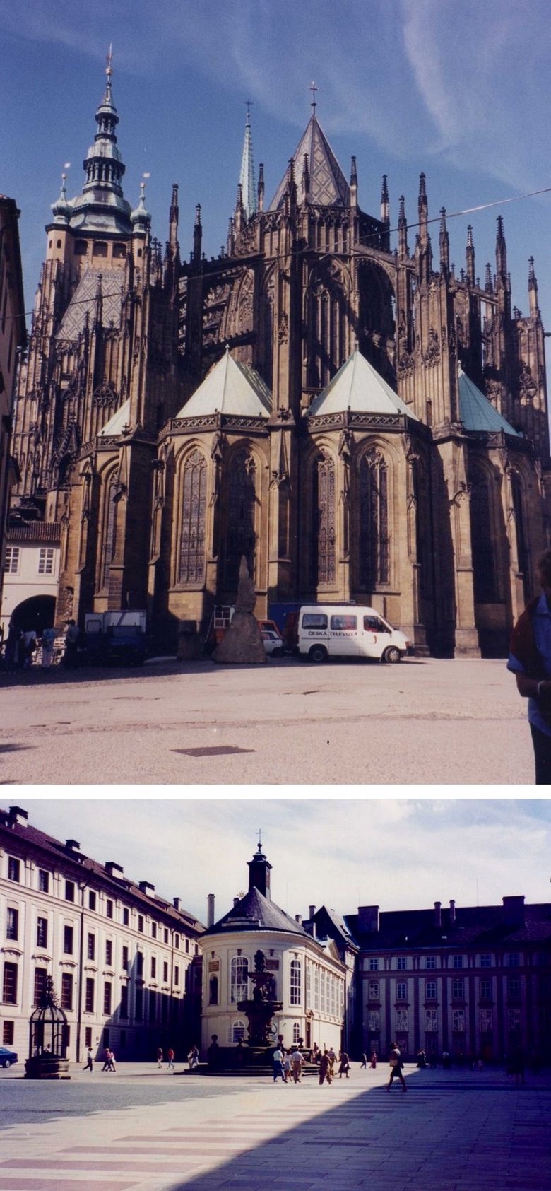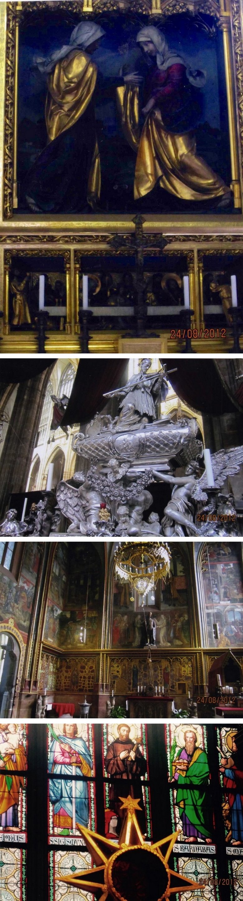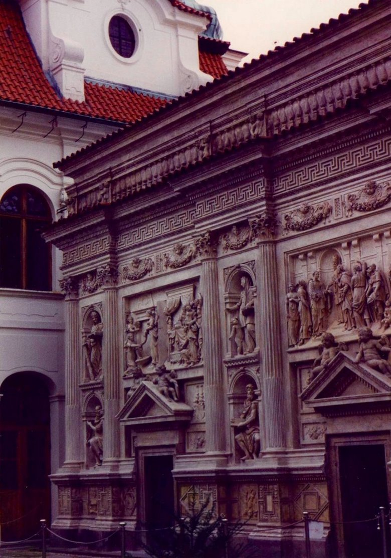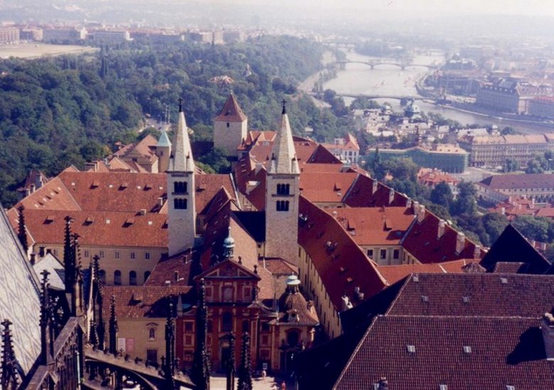 En el segundo patio puede visitarse la Capilla de la santa Cruz que guarda el tesoro cardenalicio. Contiene piezas de gran valor histórico y artístico que comienzan con el príncipe Wenceslao y culmina con el emperador Carlos V. También se observa un conglomerado de construcciones dispuestas con gracia y simetría, pasándose luego al tercer patio donde se destaca la imponente presencia de la Catedral de San Vito, la iglesia barroca más importante de Praga. Aquí están enterrados los reyes y emperadores que gobernaron el reino y se guarda el tesoro real. La obra comenzó bajo el reinado de Carlos IV, el gran constructor y siguió evolucionando hasta terminarse recién en el 1929, casi 600 años después de su comienzo. El frente de la Iglesia es una filigrana, con un rosetón en su parte media, de unos 10 metros de diámetro, con escenas de la creación del mundo; por debajo, luce una bella puerta de bronce donde se tallaron exquisitos bajorrelieves. En ambos lados surgen hacia el cielo, dos torres aguzadas, decoradas con las estatuas de distintos santos. El conjunto, difícil de apreciar por sus dimensiones, produce un impacto estético extraordinario. Y sus paredes laterales no son menos atractivas; la que da al este, hacia la fuente de San Jorge, muestra ventanas almendradas en paredes de mármol recubiertas por rejas bañadas en oro que refulgen con la luz del sol mañanero. Sobre ellas brilla la letra R que se corresponde con el rey Rodolfo II Escudos y mosaicos coloridos confieren al conjunto un equilibrio y encanto singular, rodeando a su torre principal, que se ubica sobre el crucero y que se eleva unos 100 metros hacia ese cielo azul que en mis visitas lucía inmaculado. La tentación de subirla fue insuperable y por dos veces transcurrí sus 293 escalones hasta el mirador superior, previo pago de la entrada, desde donde pude disfrutar de la vista insuperable de estos pulidos techos rojos de la Mala Strana, la silueta inconfundible de San Nicolás y más allá, la cinta plateada del moldava, sus puentes y la ciudad vieja con las agudas torres de sus incontables iglesias entre las que sobresale la extraordinaria Teyn.