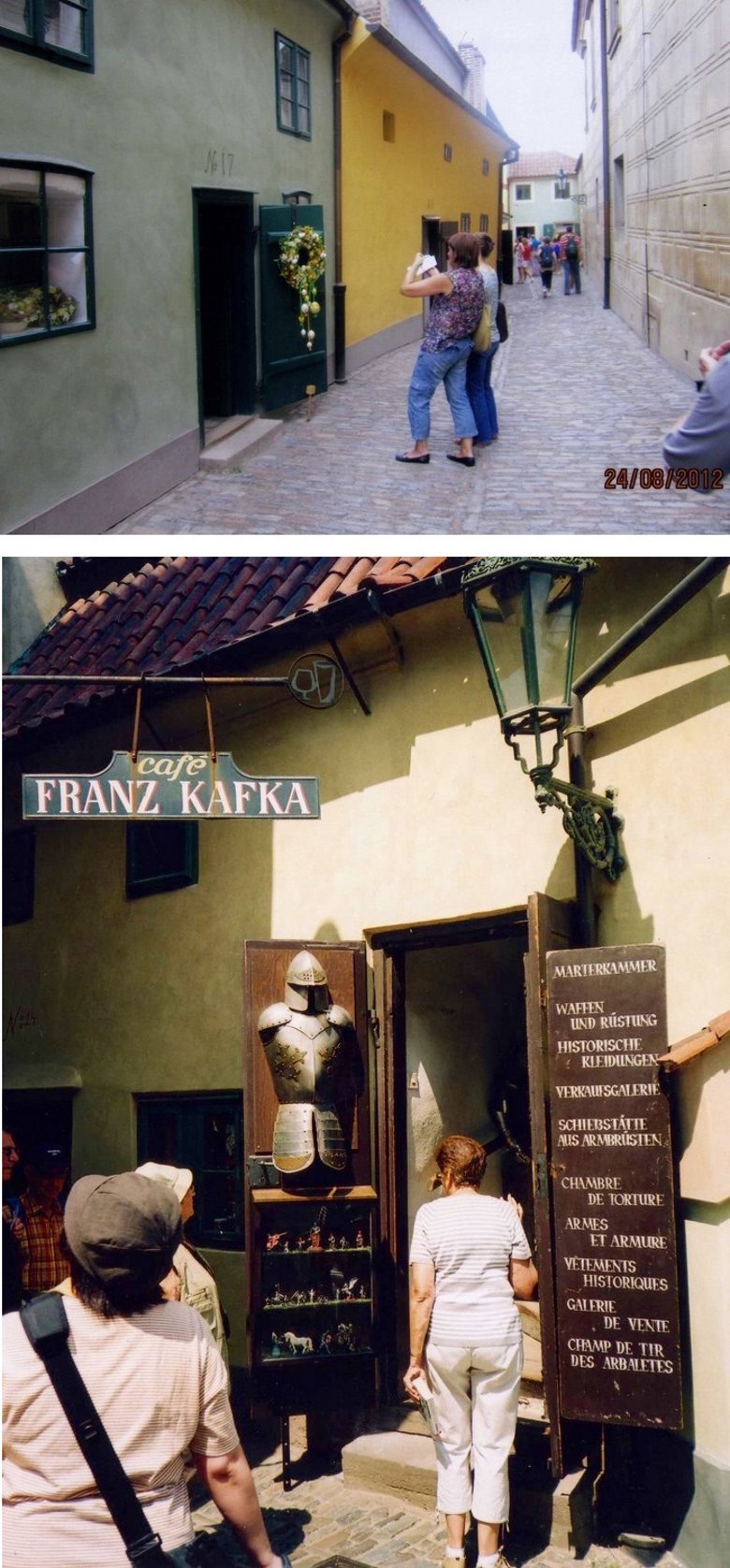 Saliendo de este patio por una calle en bajada, de empedrado ingresamos a la parte posterior de la ciudadela que contiene en el espesor de sus anchas murallas, un museo de armaduras, bares y negocios y el famoso “callejón del Orfebre” una de las atracciones del Castillo. Sobre esta angosta callejuela con empedrado grueso e irregular, casi formando parte de la muralla misma, se observan una sucesión de pequeñas viviendas con espartana presencia pero muy rica historia, Según la leyenda, en una de esas casitas trabajó el famoso alquimista Rabbi Low, contratado por Rodolfo II para obtener la piedra filosofal que trocara los metales en Oro. En otra minúscula habitación, que ostenta el n° 22, pasó unos años el inigualable Kafka escribiendo allí algunas de sus novelas memorables. Por las características del habitáculo, bien pudo escribir aquí su “Metamorfosis” donde el personaje queda reducido tras el sueño a un negro escarabajo. Y también “el Castillo” por la vecindad omnipresente de los salones reales. Recuerdo al paradigmático señor K, agrimensor contratado por el señor del Castillo, vivir esa realidad casi onírica en sus peripecias sin fin, para intentar el cumplimiento de sus tareas. En su prosa fantástica los personajes cambian o mutan según las circunstancias y como en los sueños, la sinrazón de nuestros temores se ven materializados. También nos muestra la aniquilación del individuo, en sus valores y derechos frente a la máquina implacable e insensible del Señor (el Estado) que sólo atiende a sus propios privilegios, como seguramente lo experimentó en sus tiempos. Así, nuestro obstinado señor K, busca el encuentro con su empleador, pero los caminos se desvían permanentemente sin llegar a destino. Hay algo inexorable en ese ordenamiento superior, por lo que toda tentativa fracasará sin remedio. Sí, allí en esa casucha del número 22, la febril imaginación de un genio, inmortalizaba el mundo misterioso de Praga con mucha más fuerza que toda la saga de las testas coronadas del Castillo.