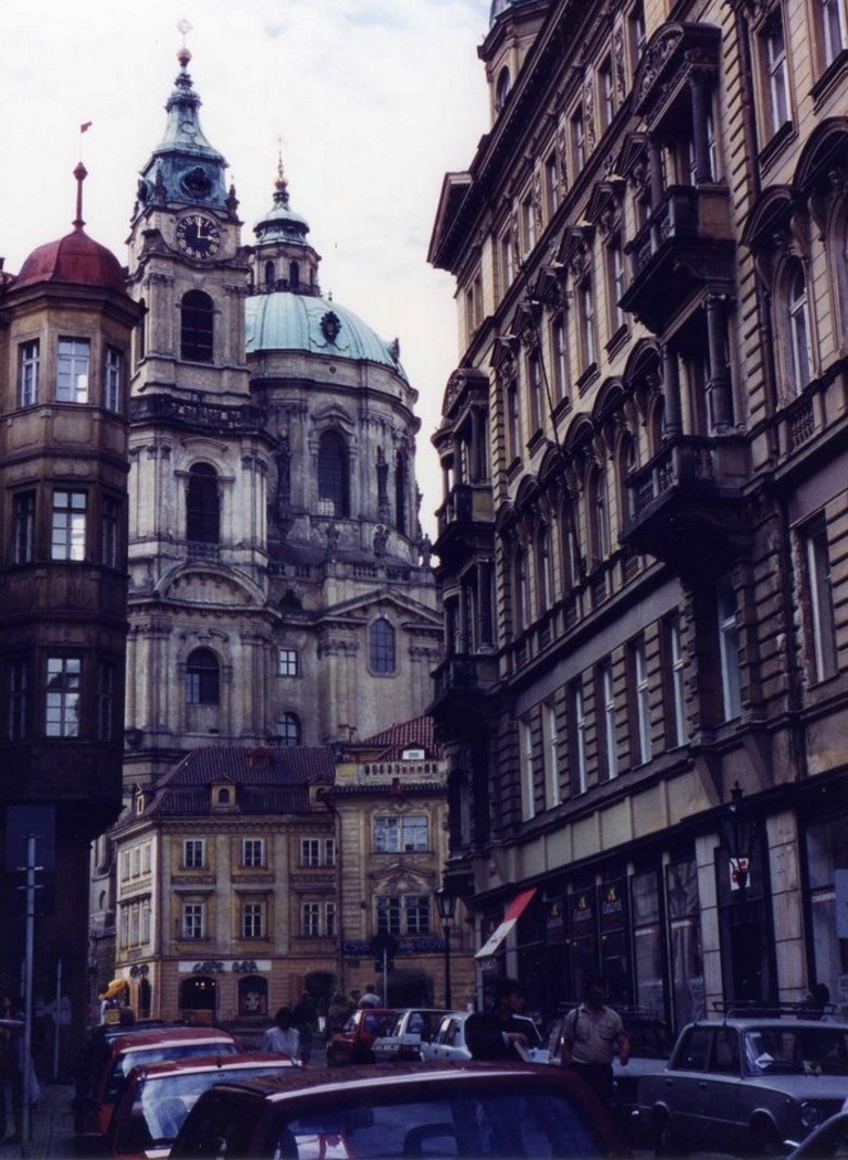 Poco después del puente, se ingresa en una espaciosa plaza con edificaciones extraordinarias. Hacia la derecha se destaca la mole enorme de la Iglesia de San Nicolás, enfrentada con un viejo colegio Jesuita. Su silueta monumental, se destaca por sobre las bajas colinas donde asientas las otras construcciones de Mala Strana. La iglesia en sí, es una bella expresión de este tipo de barroco; su interior es impresionante, con una gran cúpula central que se eleva 75 metros del suelo pareciendo suspendida en el aire. El techo contiene un monumental fresco de Kraker con escenas de la vida de San Nicolás. El coro y las estatuas que adornan el interior, vales una observación detenida.