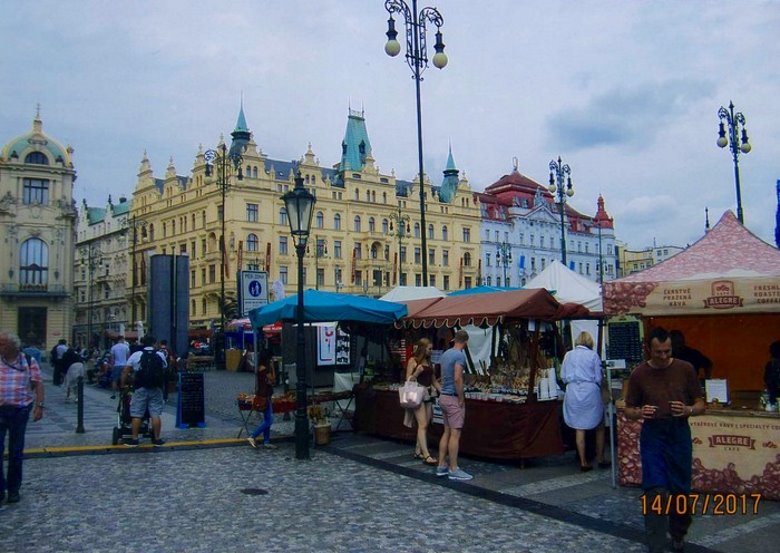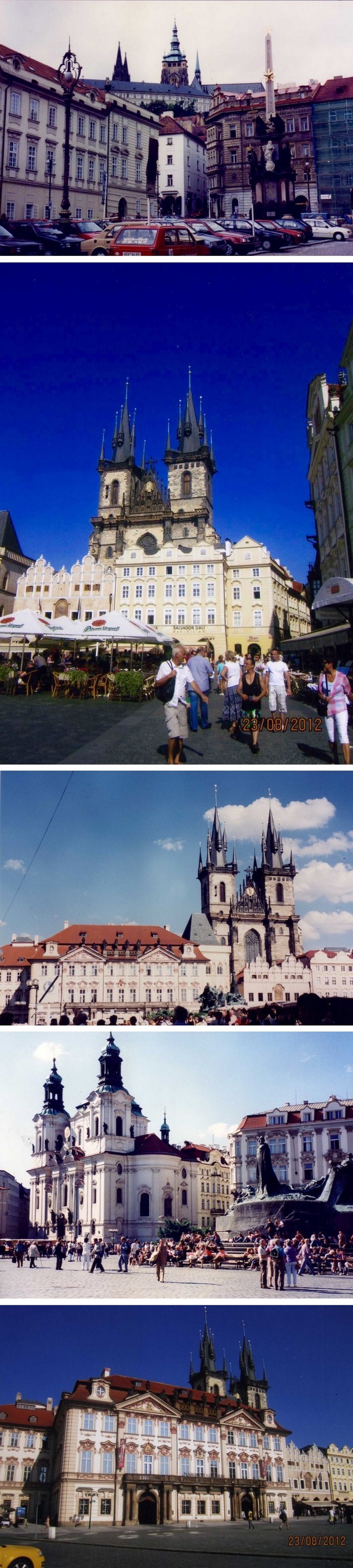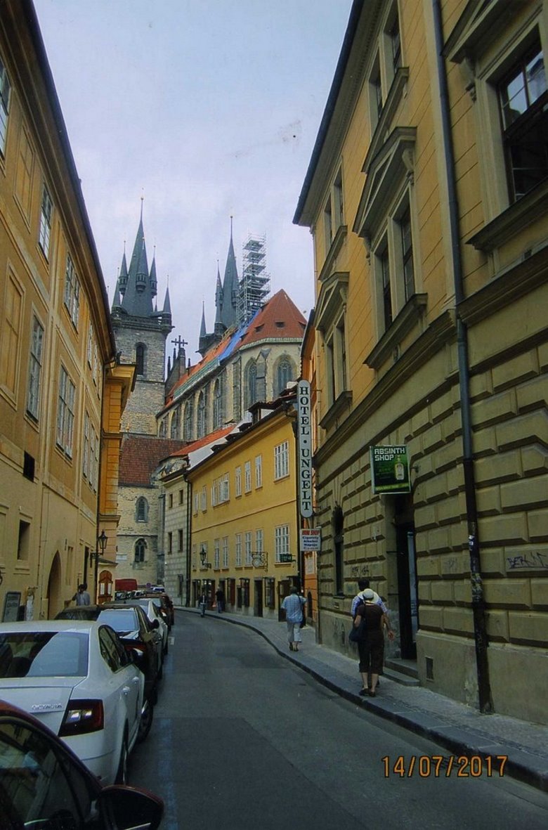 Esta plaza, de suelo empedrado, cruzada por miles de turistas, carros tirados por caballos y viejos automóviles, muestra un entorno alucinante. Enfrente del Ayuntamiento, se levanta la iglesia ícono de Praga o Iglesia de Teyn, de origen husita, que tiende al cielo sus 2 torres obscuras como las alas de un enorme murciélago. Su colosal presencia, causa al observador un impacto imborrable. Reiteradas veces me he detenido a admirarla y siempre me ha impresionado vivamente.