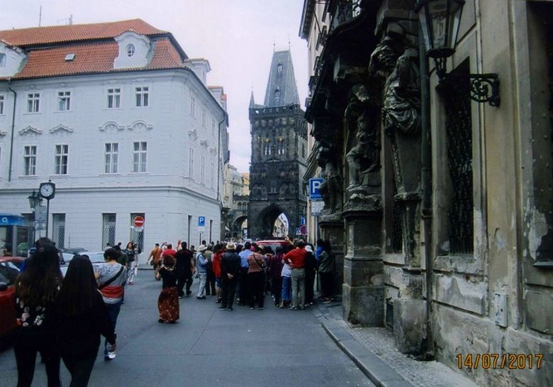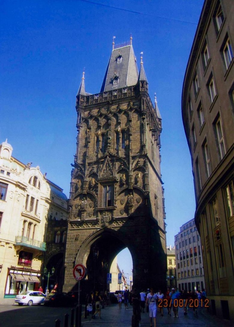 Antes de salir de “staré mesto” algunas de referencias de valor para el caminante. Si regresamos a la plaza vieja y ahora salimos por la calle “celetná ul”, terminaremos en otra torre con el techo negro pizarra característico de todos estos edificios en Praga, que formaba parte de una antigua muralla que se conoce como “la torre de la Pólvora”.