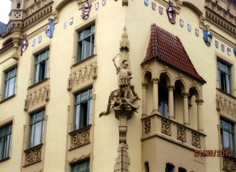El resto de grandes edificios que cierran la plaza, son igualmente fascinantes. Las fachadas, con excelente conservación, ostentan rostros y escudos, emblemas de bronce o figuras indicativas del oficio o la actividad desarrollada por los dueños primitivos, Si continuamos ahora, más allá de la casa El Minuto, por las serpenteantes calles que rodean a ese centro, llegamos a un pequeño espacio donde podemos reconocer una hermosa fuente con enrejado, se trata de “la plaza pequeña” que mantiene el ambiente de las antiguas tiendas. Todas con motivos conmemorativos en sus fachadas. En esos recovecos damos con un edificio renacentista, la casa de los “dos osos dorados” y el barroco palacio de Hrzán o el “Ciervo Dorado”, edificada en piedra. Muy cerca se levanta “la madre negra de Dios”, de estilo cubista, completando un crisol de estilos que ayudan a crear una atmosfera irreal y subyugante de la ciudad vieja. Si avanzamos por pasadizos angostos y atravesamos arcos dorados o sombríos, podemos regresar sin proponernos a la gran plaza vieja ya que toda esta telaraña de pasadizos terminan allí, quizás luego de descubrir otra iglesia cuyo frente exhibe tallas muy bonitas en un marco austero, es la de San Miguel, donde predicaba Hus.