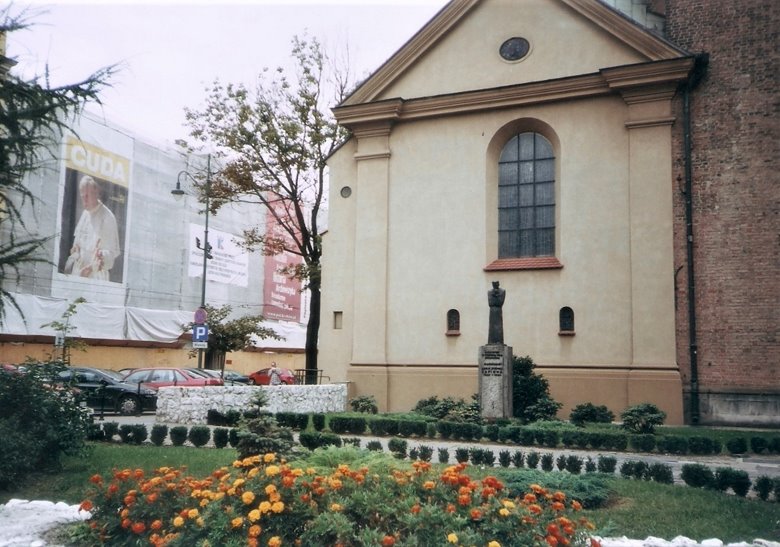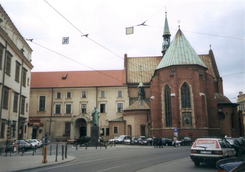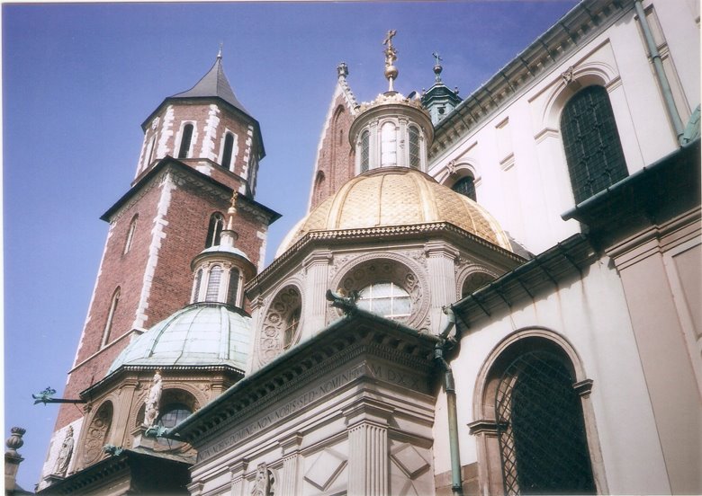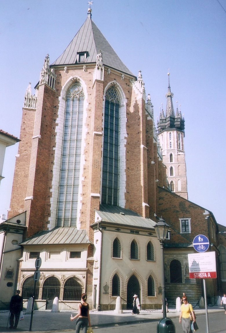 Como broche de oro de esta descripción, nos queda la joya más preciada de las venerables construcciones que rodean la plaza. Me refiero sin duda a la particular basílica de nuestra Señora de la Ascención. Sus comienzos se remontan a 1220 con las habituales destrucciones y reconstrucciones que producen las guerras o los incendios. La fachada de la catedral está orientada hacia el este, como se acostumbraba entonces, por lo que queda algo oblicua respecto a la plaza y se distingue por la presencia de dos torres de altura y estilos diferentes proyectadas por dos hermanos en competición y pugna constante. La torre menor, con 69 m. de altura, tiene una cúpula renacentista y cinco campanas por lo que funciona como el campanario. La mayor, de 81m, muestra una cúpula con reminiscencias góticas y en su aguzado extremo superior, se encuentra una esfera dorada de 2.5 m de diámetro y 350 kg. que guarda un escrito con la historia de Krakovia.