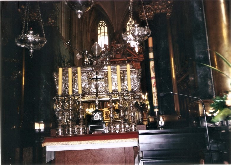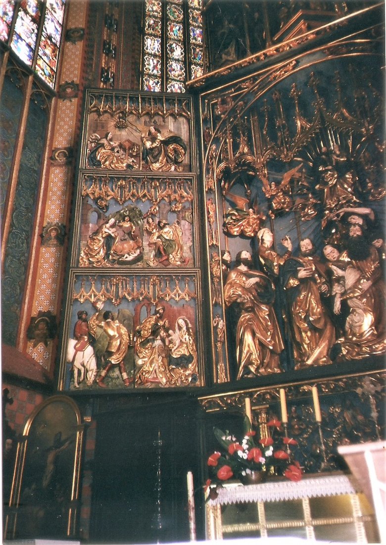 Considerado por Pablo Picasso como la 8ª maravilla del mundo, este retablo mide 13 m. de altura y 11 m. de ancho. Se halla constituido por cinco paneles que se pliegan sobre sí, cuando la catedral está cerrada y que son de una vivacidad y realismo increíble por lo que es considerada como la pieza maestra mayor del arte gótico en Polonia. El panel central muestra a la Virgen rodeada de los apóstoles, mientras que las secciones laterales, exhiben distintos momentos en la vida de María y de Jesús. En su parte superior, observamos la coronación de la Virgen en el cielo y en ambos lados del altar se levantan las estatuas de San Adalberto y San Estanislaus. Realmente es un conjunto magnífico que podría justificar por sí sólo un viaje a Krakovia. Durante nuestra estadía, como lo señalé, varias veces fuimos a la catedral para gozar con la contemplación de esta obra impar. Estas imágenes, que he fijado en mi memoria y en las fotografías que pude tomar, me recordarán por siempre mi observación asombrada.