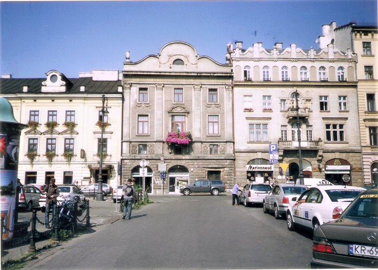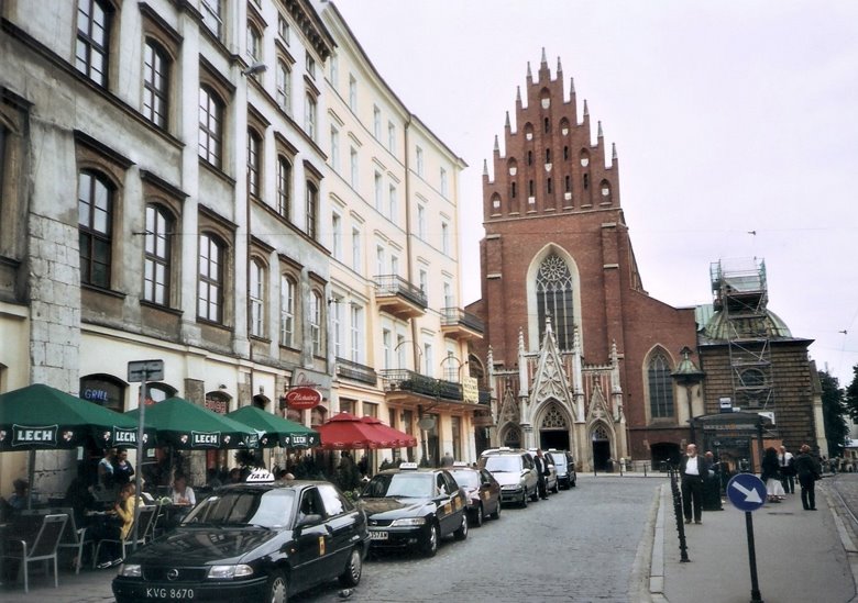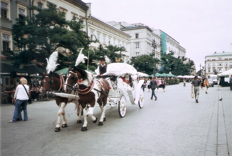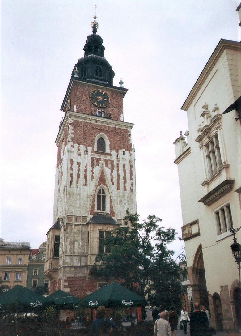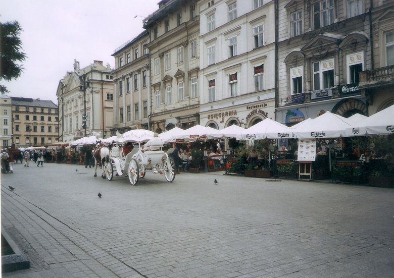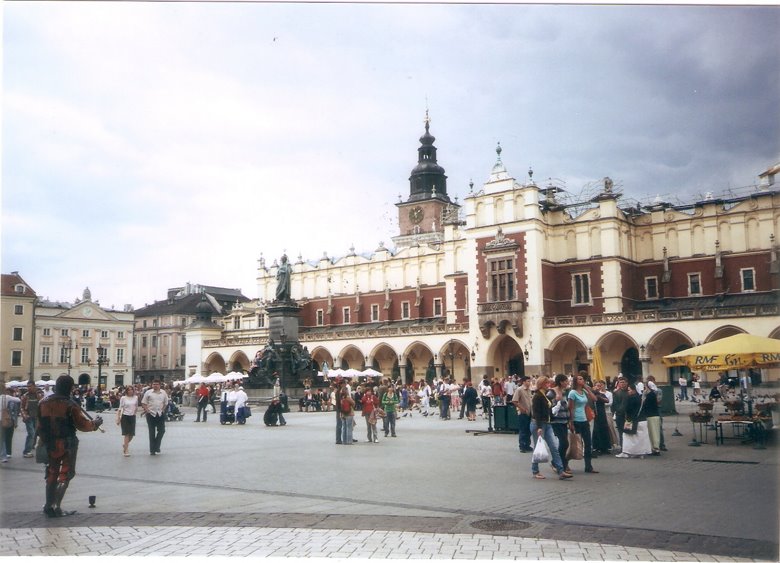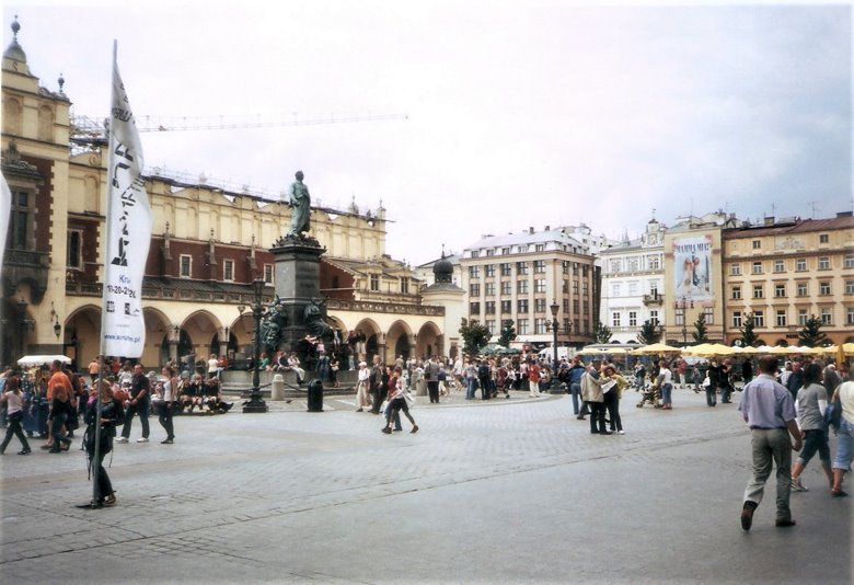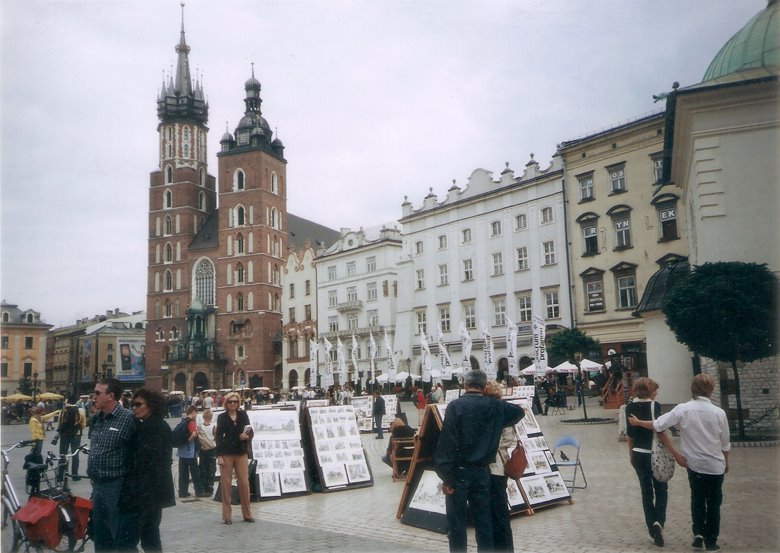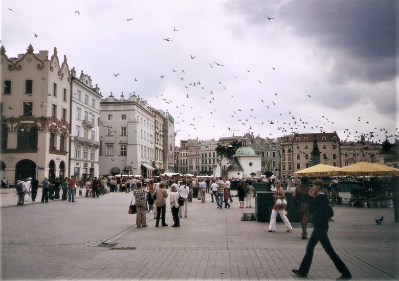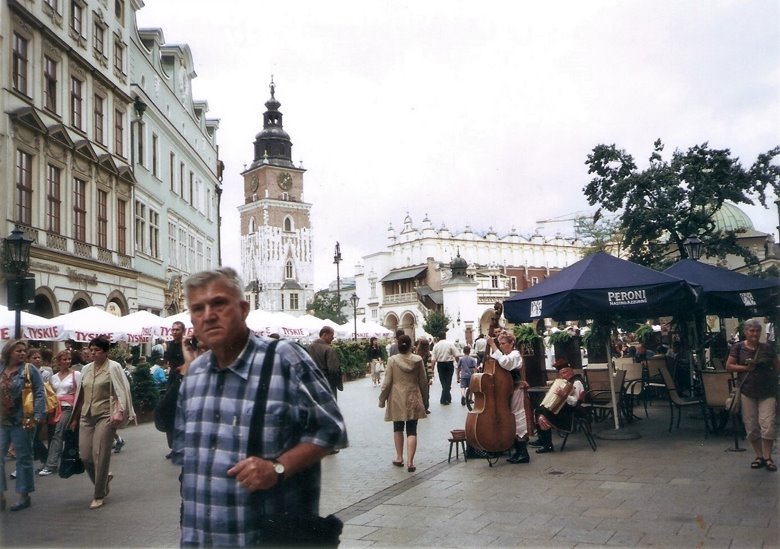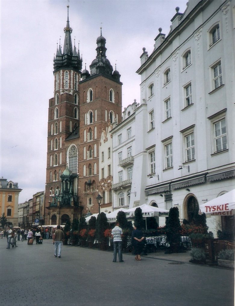 Desde este punto y caminando poco más de 10 cuadras al norte, nos internamos por segundo día en la ciudad vieja, en dirección a la plaza central o Rynek Glowny. Pasamos por la Basílica y el monasterio de San Francisco, que luego merecerá un comentario especial, atravesamos una plaza arbolada e ingresamos en una calle peatonal, ahora con edificios elegantes de 3 a 6 pisos y en aceptable estado de conservación. Esta peatonal desemboca en una gran plaza seca que se abre ante nosotros: hemos llegado al corazón de la ciudad vieja o Ryneck Glowny, por su lado sur. Este amplio espacio que mide 200m. por 200 m., es decir, incluyendo 4 manzanas, es una de las plazas más grandes de Europa,y está rodeada de construcciones de aspecto neoclásico pero sus orígenes pueden rastrearse hasta la edad media.