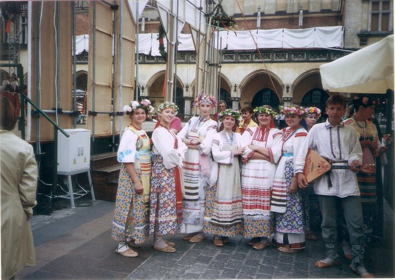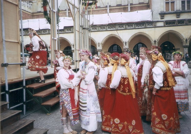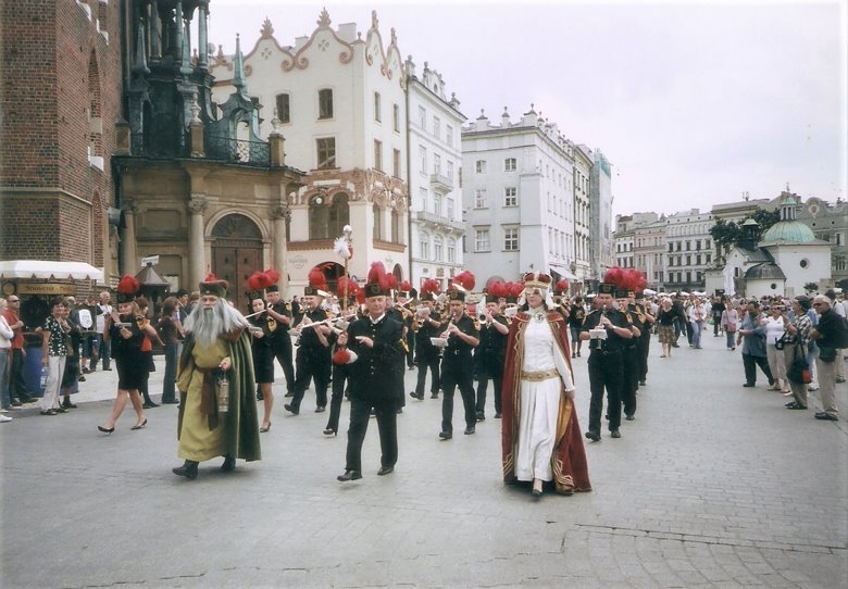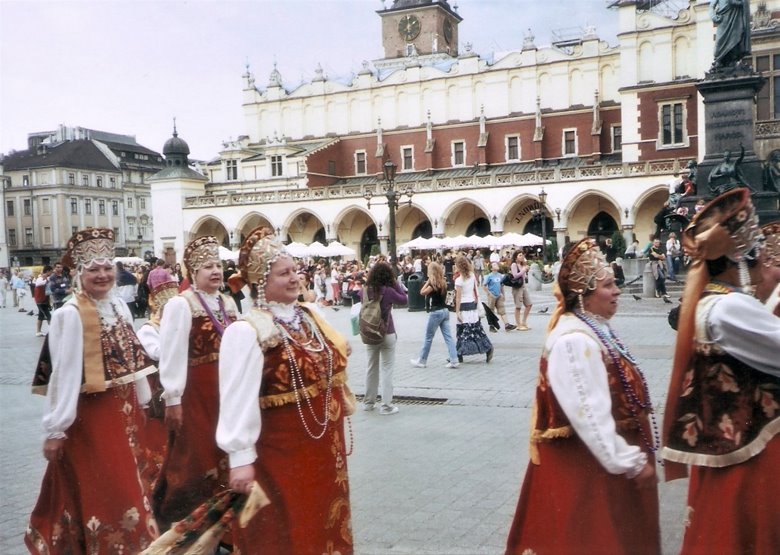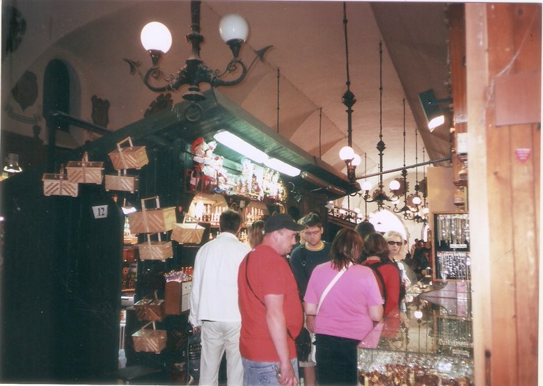 Cerca de San Adaberto, se levanta la estatua de Adam Mickiewicz, poeta polaco, rodeado por figuras alegóricas, y en, el centro mismo de la plaza, el extenso edificio de un mercado que proviene también de tiempos medievales, denominado “Sukiennice” o Lonja de los Paños, con unos 110 metros de longitud y dos plantas; las inferior con puestos de venta de alimentos, ropa y artículos varios, pletórica de gentes y colorido y la planta superior, donde funciona un museo de arte contemporáneo. Además, la plaza está colmada de palomas que cuando se alzan en vuelo conjunto, llegan a obscurecer el cielo mientras que por las cuatro calles del perímetro, circulan entre la multitud peatonal, vistosos carruajes tirados por corceles muy ricamente engalanados, llevando turistas. Por coincidir con fechas festivas, tuvimos la fortuna de asistir a una serie de desfiles de hombres y mujeres con ropas típicas de congregaciones o grupos culturales. Algunos sólo marchaban, otros cantaban o bailaban sobre un estrado montado al lado de la torre del Ayuntamiento.