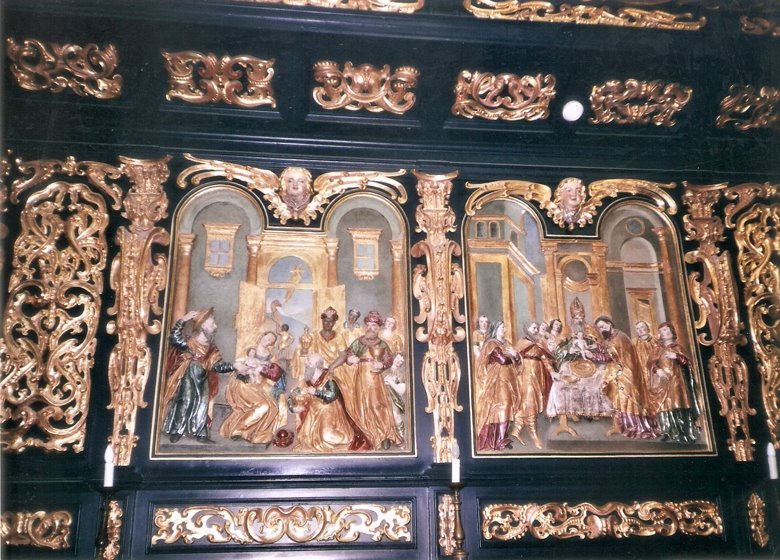 Pero el interior es lo más destacado de la iglesia. Se puede ingresar por dos puertas principales: la frontal, que es el ingreso natural, diseñado en la actualidad para el acceso de los creyentes que vienen a orar, escuchar misa o realizar donativos, es libre pero no se permite tomar fotografías y otro lateral, para el turista, con derecho a fotos, que permite apreciar el famoso altar de 5 secciones y buena parte del interior de la iglesia. Para este ingreso se paga. Nosotros utilizamos ambos en distintas oportunidades, pues visitamos la iglesia muchas veces. En el bellísimo interior, apenas iluminado, se aprecian cristales de vivos colores que adornan a los ventanales (vitreaux) que datan del siglo XIV. El techo muestra un intenso color azul cuajado de estrellas. Un impresionante Cristo parece suspendido en el aire a nivel del crucero y doradas pinturas murales cobran vida en las penumbras de la nave. El altar, merece un comentario aparte.