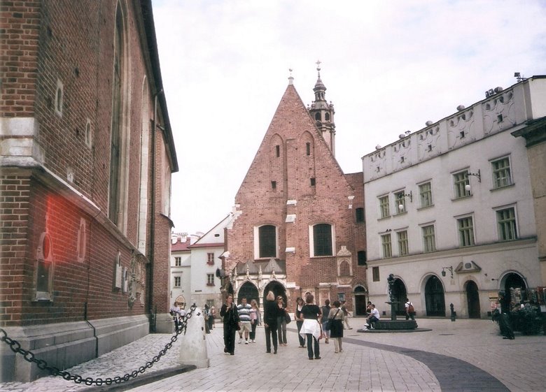 Numerosos restaurantes y bares entoldados se extienden a las veredas que la rodean y en su centro, al sur, se destacan la pequeña iglesia de San Adalberto que data del siglo XI, la más antigua de Krakovia y que ahora sólo tiene valor testimonial o arqueológico. Más al centro, se ve la bonita torre del ayuntamiento (el resto del edificio desapareció), de 70 m. de altura, a la que se puede subir para apreciar una vista general del lugar.